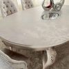 Восхитительная композиция для столовой комнаты включает в себя: обеденный стол, витрину и стулья. Вся мебель изготовлена из древесины с дальнейшей окраской. Обеденный стол имеет овальную столешницу, в средине которой по стеклом находится резной цветок ручной работы. Ножки стола выполнены в необычной форме с элементами резьбы. Стулья одновременно удобны и красивы: мягкие сидения, изогнутые ножки, задние из которых переходят в резную опору для спинки изделий. Входящая в композицию 2-дверная витрина оснащена стеклянными полками, зеркальной задней стенкой и подсветкой. Декорирована резными и фигурными элементами. Сверху может украшаться резной виньеткой.