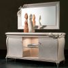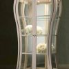 Оригинальный гарнитур для гостиной, один угол каждого предмета которого, за исключением стульев, украшают симметричные резные ветви. Угол каждого стула оформлен в виде спинки переходящей в его ножку. Вся мебель изготовленная из древесины и поставленная на фигурные ножки. Витрина и низкий шкаф имеют изогнутые линии фасада и оснащены подсветкой своих стеклянных полочек. Задняя стенка витрины – зеркальная. Как дополнение к композиции превосходно подойдут высокие кресла с одним или двумя подлокотниками, исполнены на подобие стульев, и прямоугольное настенное зеркало. Возможны разнообразные варианты отделки и окраски.
