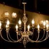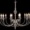 Люстра, оснащена 12 плафонами в виде свечей, в классическом стиле. Отделка металла: фольгированное серебро.