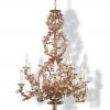 Роскошная объемная люстра в три яруса с выразительной композицией из переплетенных ветвей изысканных роз. В цветочном декоре использованы фарфоровые розы, которые эффектно «расцветают» в позолоченных ветвях. Люстра рассчитана на 12 ламп-свечей, которые на разных уровнях расположены по нижнему ярусу. Люстра подчеркнет стиль романтик, античный декор интерьера, станет украшением в классическом интерьере.