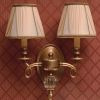 Бра с изысканной основой крепления, выполненной в виде позолоченного медальона. Стойки-держатели плафонов представляют собой эффектно завитые дуги, дополнительный шарм бра придает и выразительный декор полупрозрачным кристаллом янтарного цвета. Плафоны декорированы драпированной тканью нежного карамельного цвета.