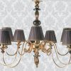 Элегантная для стильного интерьера люстра с десятью плафонами. Роскошная люстра отличается изысканностью формы изогнутых дуг, которые поддерживают изящные плафоны. Плафоны имеют эффектную отделку черной полупрозрачной тканью в драпировку с тонкой золотистой окантовкой краев верха и низа. Основание люстры украшено кристаллом янтарного цвета.