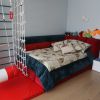 Ткань на тюли Murmure фабрики Z+R (Zimmer rohde), с фактурой льна и с неординарной вертикальной полоской, дополняет портьерную ткань Kollectioniste с тематическим морским рисунком яхт, фабрики Avigdor. Дополнительно в окантовке покрывала, был добавлен однотонный велюр Dapple velvet, английской фабрики , поддерживающий цвета фасадов стеллажа и портьеры!